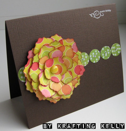 Here’s another project using the Silhouette machine. I used the 3D Ruffle Flower shape on polka dot paper for this card. Inked the edges, Stickled the brad, added rhinestones to small circle punches, and a rub-on in the corner. Quick but beautiful birthday card!