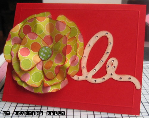 This next card was for a friend having surgery for cancer. I thought this was cheerful with the red and polka dots. And lately I like to add rhinestones to everything. I used the Silhouette for the flower and the Slice for the flourish. I used a Scor-Pal to emboss the rectangle on the background.