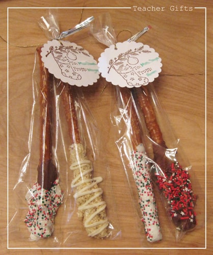 Finally, the kids made dipped pretzels with Grandma for their teachers. I made quick tags using a scallop punch and a rubber stamp by Stampin’ Up.