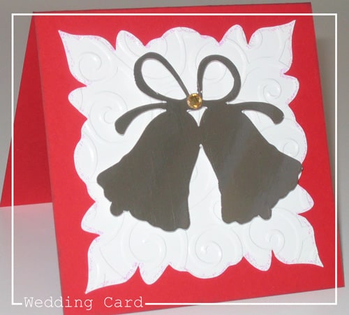For this next card I used the Slice again to cut out the decorative white background (Wedding design card). I also ran that through the Cuttlebug in an embossing folder. The Slice also cut the bells out of metallic gold paper (also Wedding design card). I used the i-Rock heat setting tool to put on the gold rhinestone. I added a little glitter glue to the outer edge of the white paper, as well.