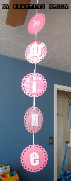 I used the Silhouette to cut out the scalloped circles, the inner circles, and the letters, then embellished with flowers and tiny self-adhesive rhinestones. The scalloped circles were cut from double-sided patterned cardstock, so on the backside of “sweet” I put “be mine”.