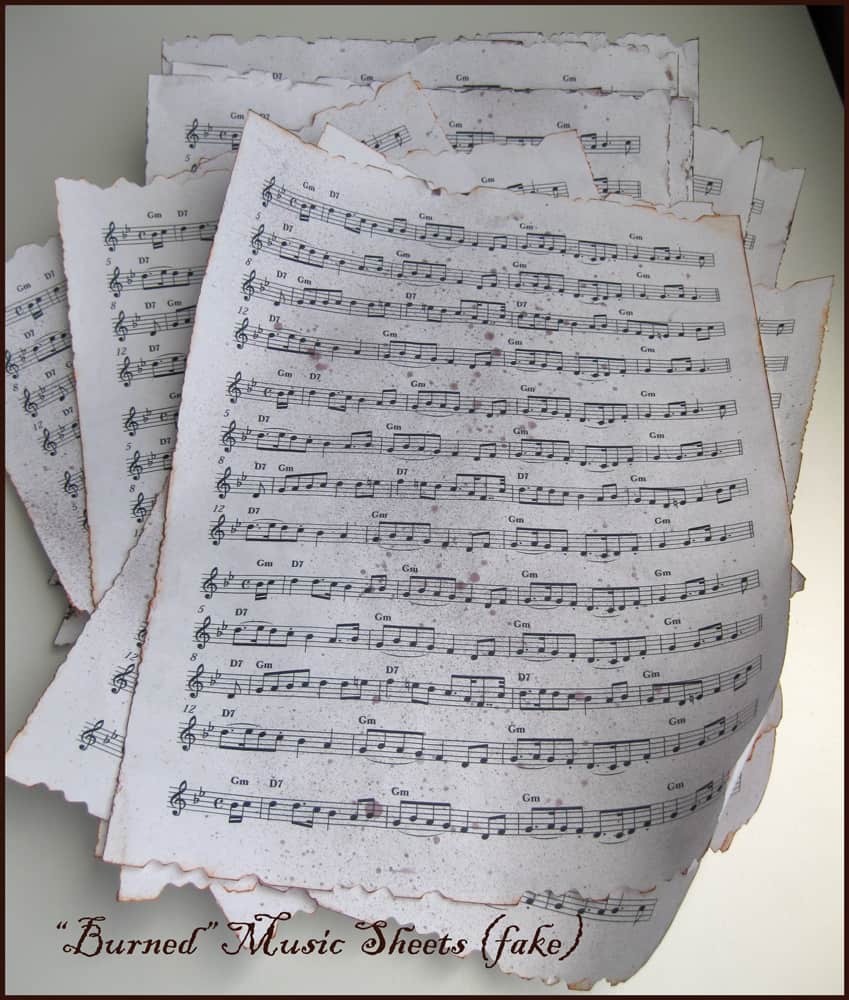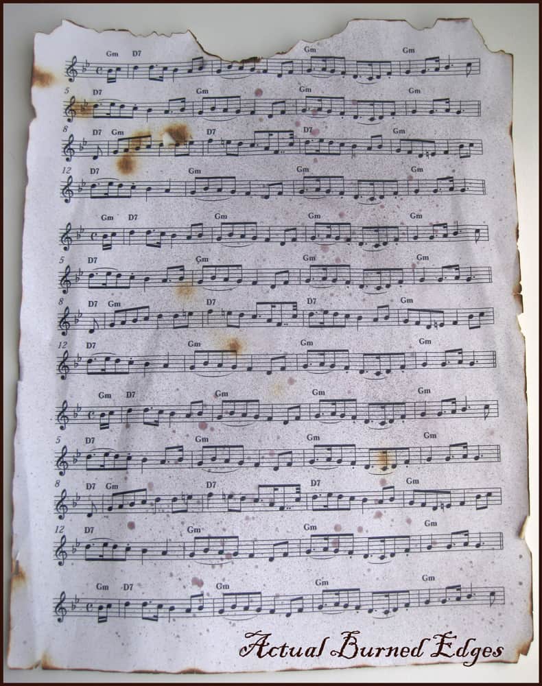 Then I needed to burn the edges of the sheet music, all 40-50 pages I had printed. I sat and burned the edges of one with a candle when the kids were all gone or napping so they wouldn’t see me playing with fire, and quickly realized it would make a mess and take forever to burn all those edges! So back to the scrapbooking tools. As I examined my actual burned page I knew I could use a brown ink pad on the edges, and saw that my old deckle-edge decorative scissors would probably look O.K. to snip the edges.