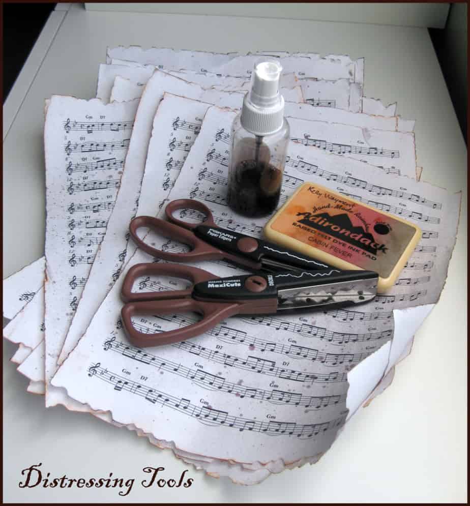 For the sheet music, I knew I could find some digital scrapbook paper somewhere, but hate to use my color ink in my printer if I don’t have to. And no point going out to buy a distressing kit because I’ve got a LOT of scrapbooking stuff I’ve collected over the years. So I found some free sheet music online and copied and pasted it to fill a page. Before I printed it, I spritzed all the pieces of paper with some liquid distressing ink mixed with water in a spray bottle. Once the pages were dry I ran them through my printer using only black ink. I’ve had the distressing ink for ages and have only used it once or twice, so now it’s served its purpose and I’m glad I didn’t throw it out.