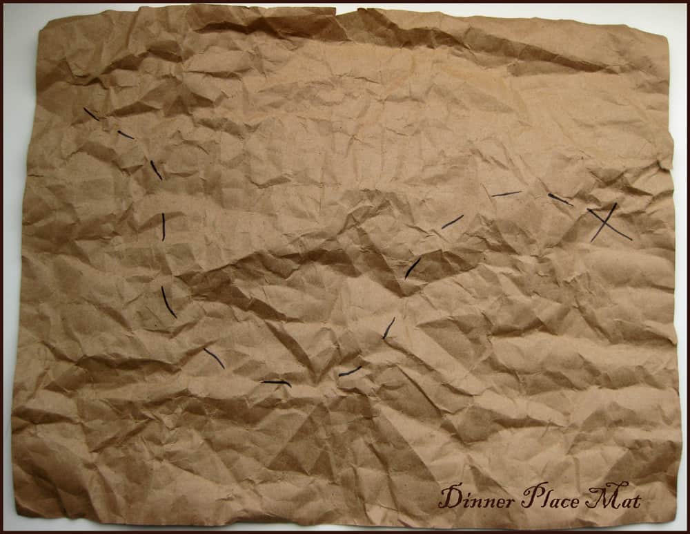 The original idea for the place mats was to use brown paper grocery bags and crumple them to look worn. I didn’t have any paper bags, but I did have a roll of brown craft paper for wrapping. I was able to get 46 sheets of 15″x12″ pieces for placemats. I crumpled them each a few times and felt it was still lacking a little, so I turned them all into treasure maps with a path and “X marks the spot.”