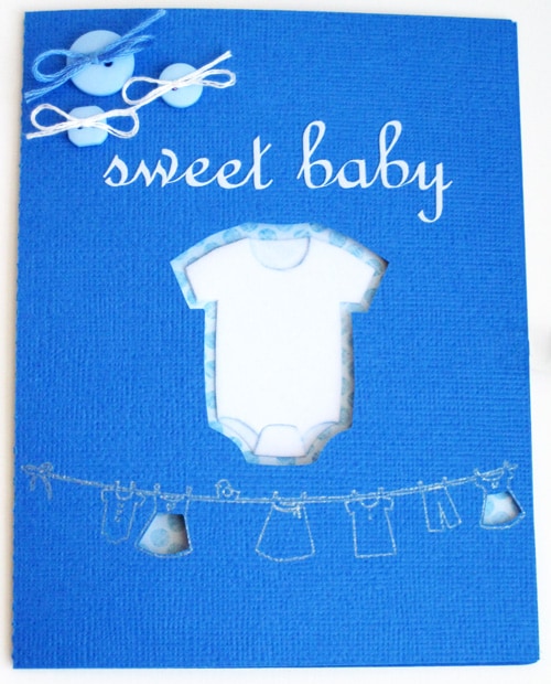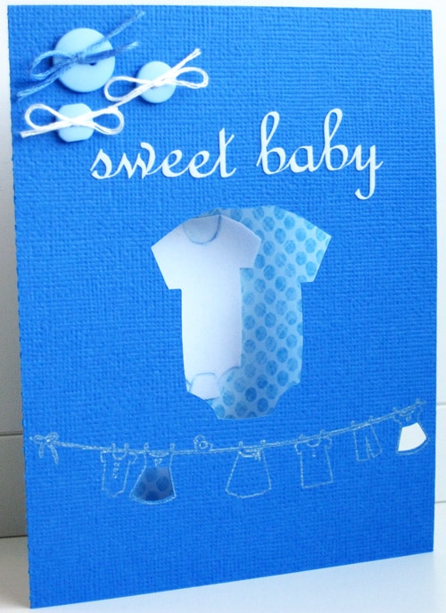 We’ve got a couple of baby boys arriving soon in our neighborhood and it’s been a while since I made a baby card. I love the white fuzzy vinyl for card titles, but it really only shows up well on dark, solid backgrounds. On the first card I decided to dress up the solid card front with my new glitter sketch pens and also create a window like in the unicycle card I made in January. The onesie is also cut from white fuzzy vinyl. I was able to ink the edges of the vinyl a little to make the layers stand out.