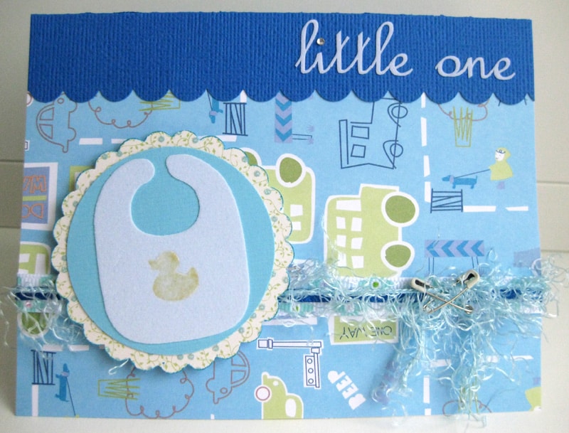 The bib in the second card is also from the same Silhouette shape set as the onesie. It has a little duck cutout in the center. I pulled the fuzzy white vinyl duck out of the center, inked it with a yellow stamp pad, and replaced it back into the center. I added a little fuzzy yarn from my knitting stash and two little safety pins I bought years ago just to use on baby cards.