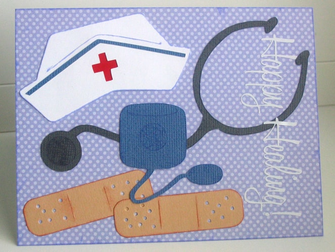 I made this card today for my mom who had a minor surgery. I used the Silhouette shapes “nurses tools” and inked the edges for extra depth. To get the tiny letters I cut them out of white vinyl with the font “Honey Script.” I just made sure my transfer tape was really low tack so it transferred O.K. to the paper.