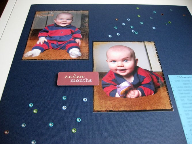 I also used digital scrapbook supplies for the label. Stampin’ Up! has a fun program called My Digital Studio with lots of cute digital products, including this “seven months” label from the Rock-a-Bye collection. I imported all the monthly labels into Silhouette Studio, traced them, and did a print and cut so they’re ready for each page in the scrapbook. I love being able to turn digital scrapbook supplies into physical embellishments!