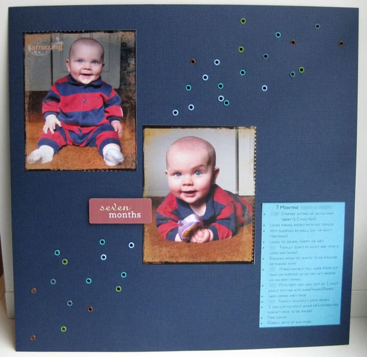 Eyelets scattered across the page – what a cool technique! Beautiful page! I love a minimalist approach to scrapping so that the real object of it is evident – the photos. This is perfect.