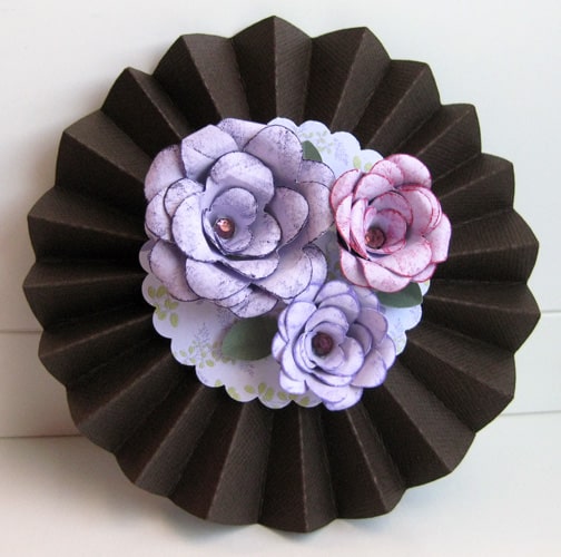 There are a lot of great Silhouette shapes people have created floating around on the internet. I got this rosette shape as a freebie from Craft and Smile blog. I used plain lilac paper and inked the edges before rolling them. The lolli shape was a weekly freebie shape (#13352) from the Silhouette store. I keep collecting them and at some point maybe most of them will get used!