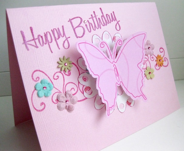 I also tried a somewhat unsuccessful technique here. I didn’t think the white fuzzy vinyl “Happy Birthday” would show up very well on the light pink background, so I inked it by blotting a dark pink pigment pad on the letters. I don’t know if it was because I used a pigment pad instead of dye ink, or if recoloring just isn’t a good idea, but I couldn’t get my tape to pick up the letters off their backing. I waited several hours and still the tape only picked up the color and not the letters. So, I used my exacto knife and picked up and placed each segment of the lettering myself. I don’t think I’ll be trying that again. 🙂