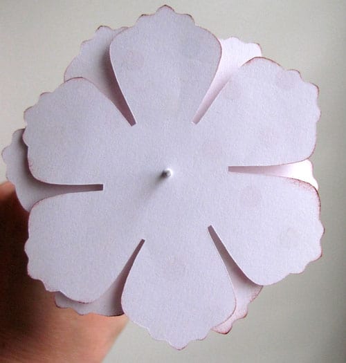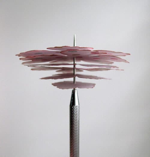 Take a piercing tool, needle, or stick pin and poke through the center of the top layer. (I use a foam mat underneath to protect my fingers and my work surface.) Slide the flower up out of the way and pierce the center of the next layer. Slide that one up, and continue until all the layers are pierced in their centers. If you can see you’re off a bit, just re-poke until it looks right.