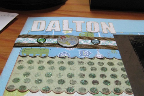 Credits: Pattern papers from Sandylion, My Mind’s Eye, imaginisce, and Deja Views. Ribbon from American Crafts and scraps, Brads from Making Memories, Button from WeR Memory Keepers, Letters from Scrapper’s Guide, Scallop edge punch from Stampin’ Up!