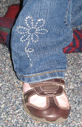I used the same flower shape (ID #7994) to decorate both the shirt and the jeans for my two girls. It comes with the swirl on both sides of the flower, but I left it off for the vertical flower on the jeans so it just looks like a stem.