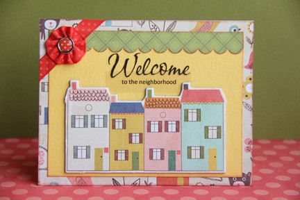And here is a card I made with the same Crate Paper “Neighborhood Collection” papers and chipboard. The brad is from Making Memories “In Bloom,” and the fonts used are CAC Shishoni Brush and Calibri. (This is my first time printing on a transparency. Am I behind the times, or what?)