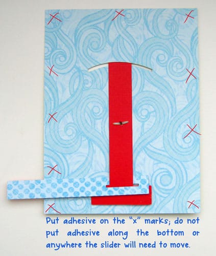 I adhere this to a plain card front (8.5″x5.5″, folded in half) to hide the mechanics.