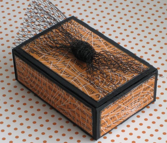3. Cut “Spiderweb” paper to fit outside edges, top, and inside flap (6 total pieces), leaving approx. 1/8” border for box to show. Ink edges with black inkpad. Glue to box sides, top, and inside flap.