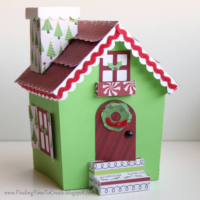 Textured Cardstock: Red (Burlap Barkley), Green (Crisscross Grasshopper), Green (Crisscross Limeade), White (Bazzill White). 2-8.5×11” for tall house, 1-12×12” or 2-8.5×11” for each smaller house. 2-12×12 white for roofs, chimneys, window backs, etc.