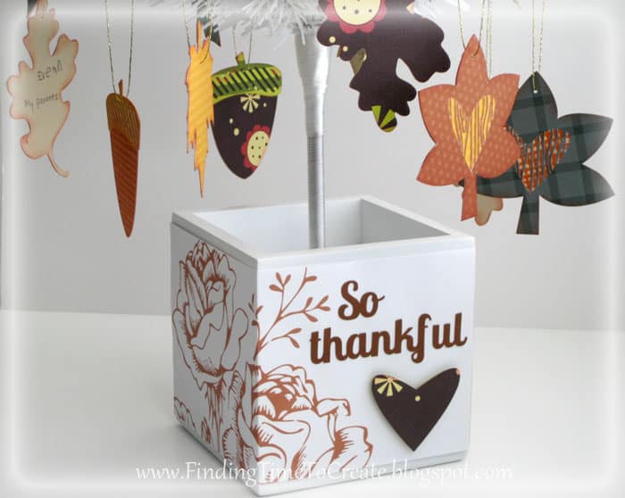 I bought this all-season tree by Doodlebug Design, cut out a bunch of leaf and nut shapes with my Silhouette Cameo, and gave 5 to each member of our family. On the back of each leaf we put our name and something we’re grateful for. Then we hung them from the tree.