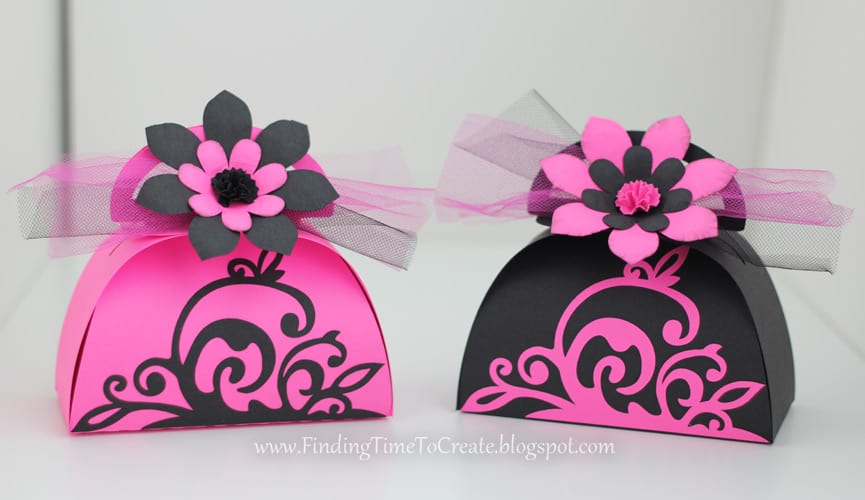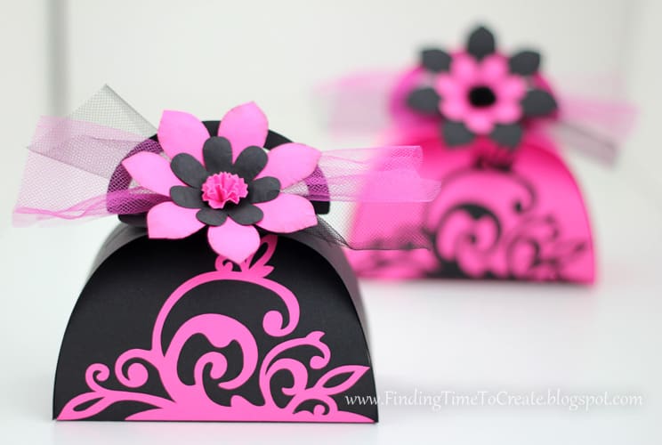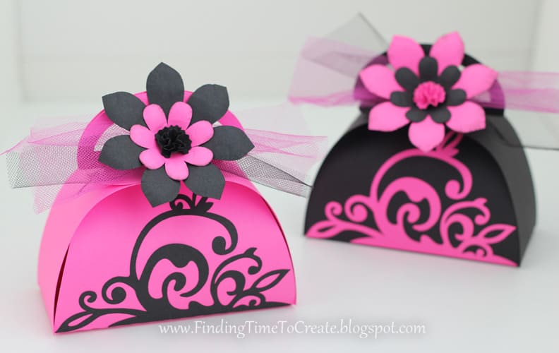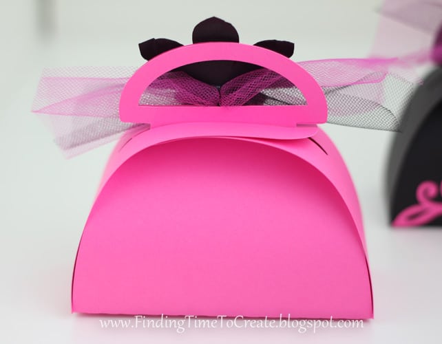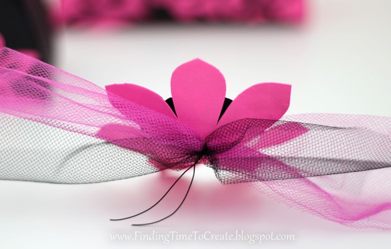 By the time I was done I had two pretty little purses with a flower for each top. I didn’t want to glue a flower on top which would impede the opening of the purse, so I grabbed some pink and black tulle and twisted a little wire around those and hot glued the flowers to the tulle. Then I just tucked the wire into the gap between the handles and it’s a perfect little party favor.