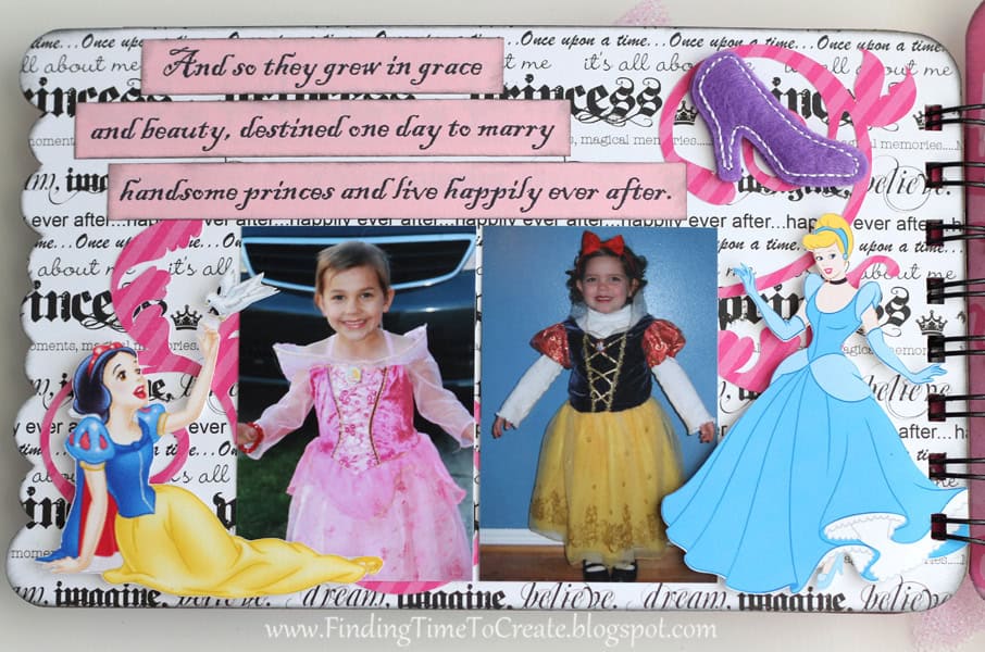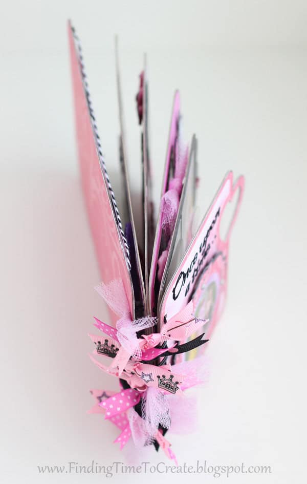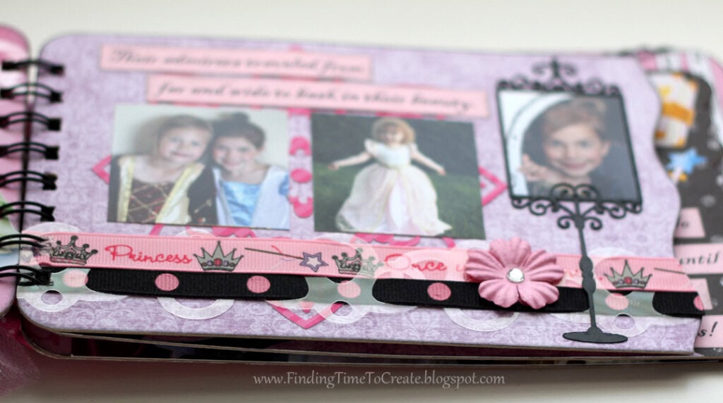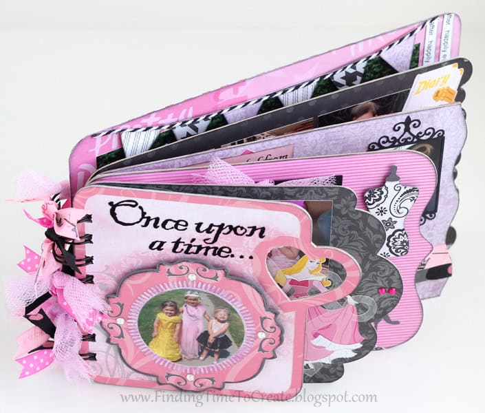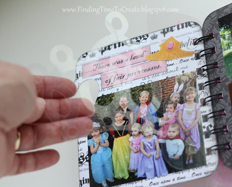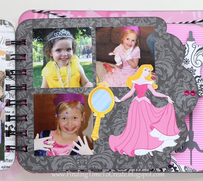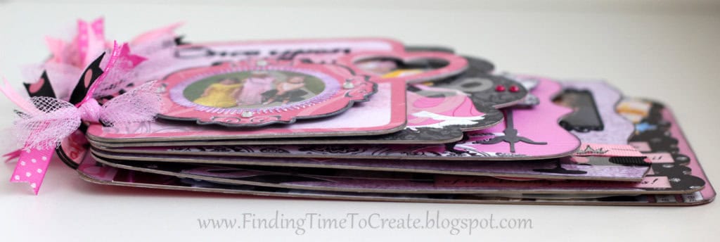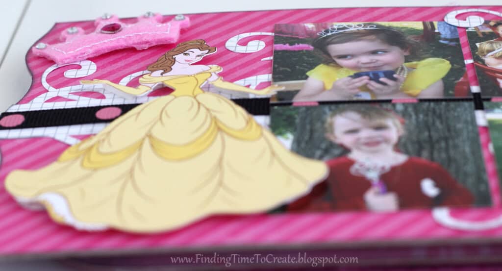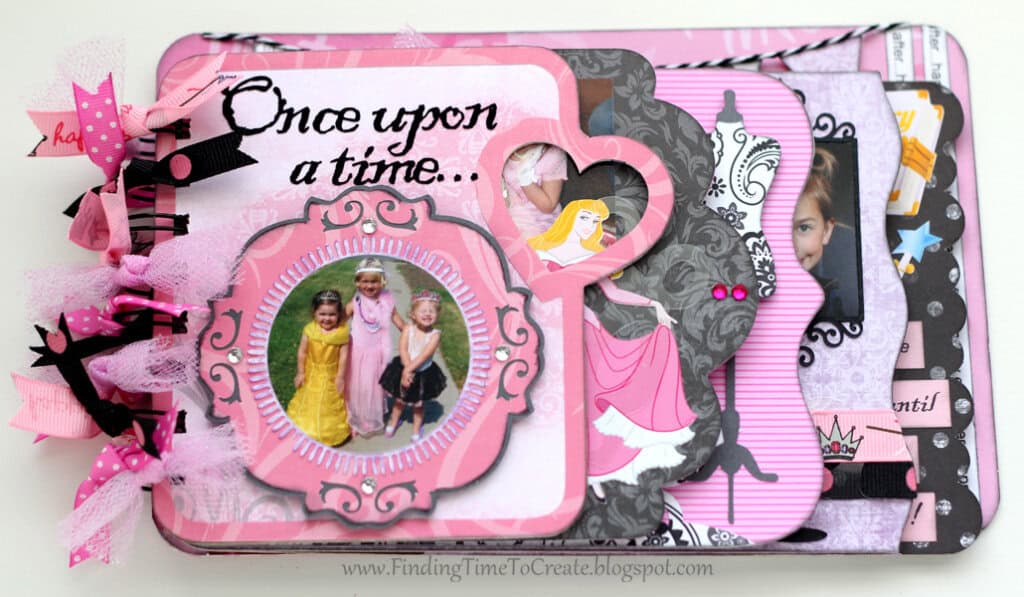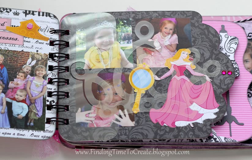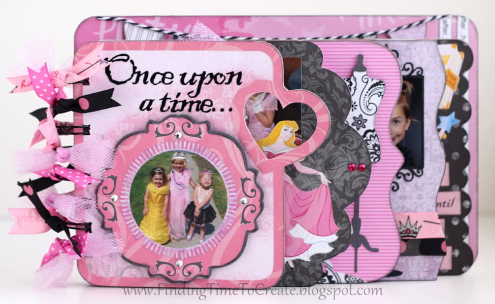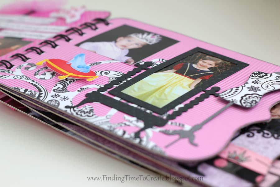 Here it is! My latest and greatest. A princess mini album. I cut everything out with my Silhouette Cameo, including the chipboard album pages. I will be sharing the album cutting file (Studio) at the end of the post, along with a printable file (PDF) in case you don’t have a Cameo machine but are willing to cut out the pages by hand.