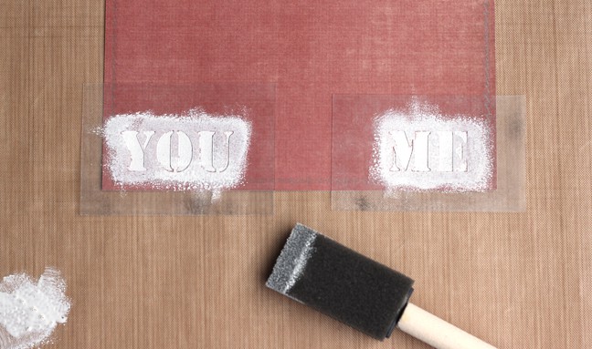 The sticky side holds it nicely in place while you add your medium. I used plain white acrylic paint here. Once it’s mostly dry, just peel away the stencil, return it to its backing, and save it for later!
