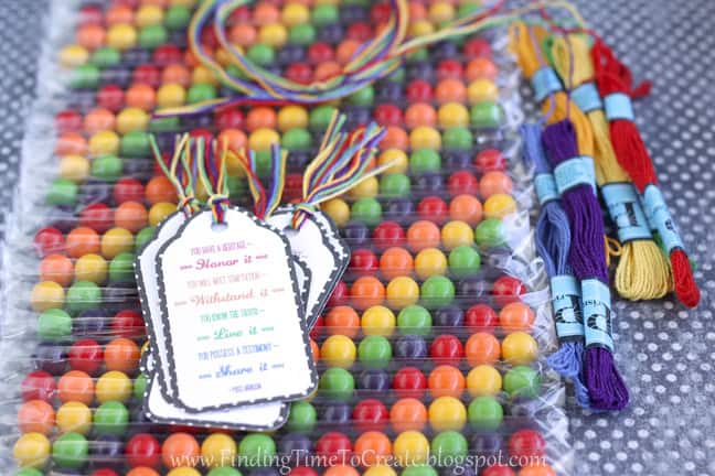 I used a bunch of floss colors in the tags to tie the colors of the YW values and the rainbow candies together.