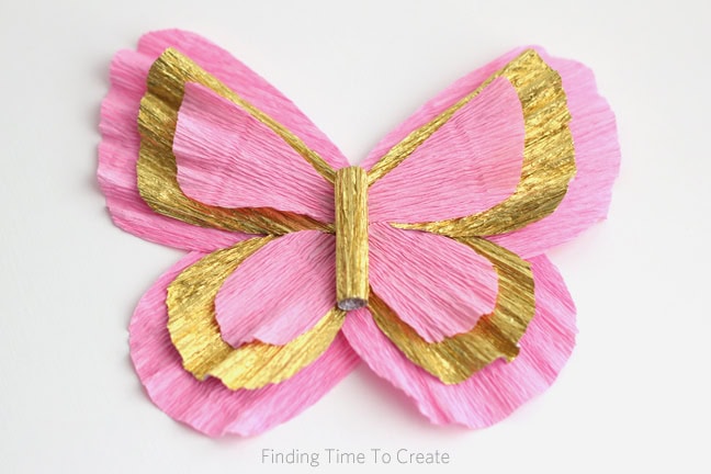 Cut out the butterfly pieces (I used bubblegum pink for the small and large pieces, and metallic gold for the medium pieces), then gently pull and spread the outside edges in small segments to give them a frilly edge. Leave the narrow tips alone where you will be gluing them.