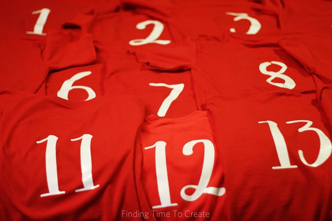 Yes, I ironed on 6″ tall numbers with white glitter heat transfer material to every one of these red shirts. It turned out so well, I’m glad I spent the time on these 14 shirts! I designed them in Silhouette Studio with Sweet Pea font, and cut them out from two rolls of white glitter heat transfer with my Silhouette CAMEO.