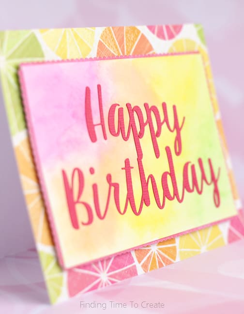 And of course, I couldn’t leave my Silhouette CAMEO out of the game, so I created a scalloped rectangle in Silhouette Studio to add a little pink border, along with my happy-birthday sentiment in Silhouette adhesive cardstock. No glue for that intricate lettering, thank goodness. 🙂