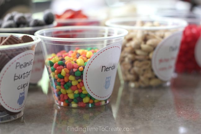 I continued with the owl theme by making sticker labels for the toppings. I used the print & cut feature of my Silhouette CAMEO to make these labels on sticker paper, and added some more owls as an accent.
