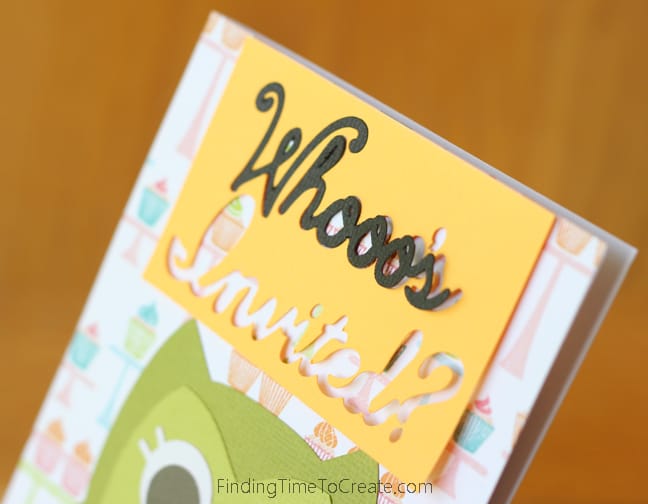 I cut the “Whooo’s Invited” sentiment out of black adhesive cardstock, after designing it with SW Par-tay Time font. I used some tricks found in this post about script fonts to thicken the letters and weld them before cutting.
