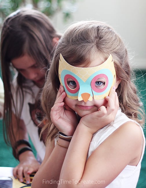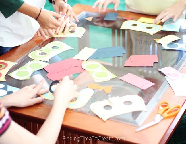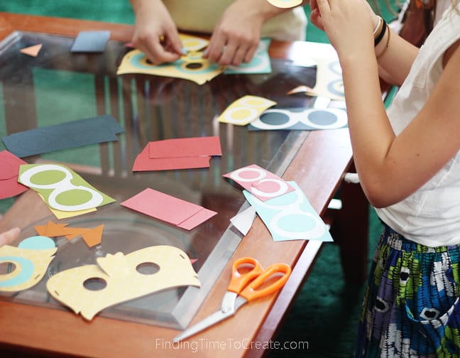 Because I do simple parties for the kids, we basically do some games, a craft, food, and gifts. That’s about it. In keeping with the owl party theme, I had the kids make their own owl masks. I own a lot of adhesive cardstock, so I cut out a variety of pieces from this mask design in different colors. I cut the base of the masks from regular cardstock, but all the other pieces acted like stickers.