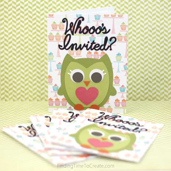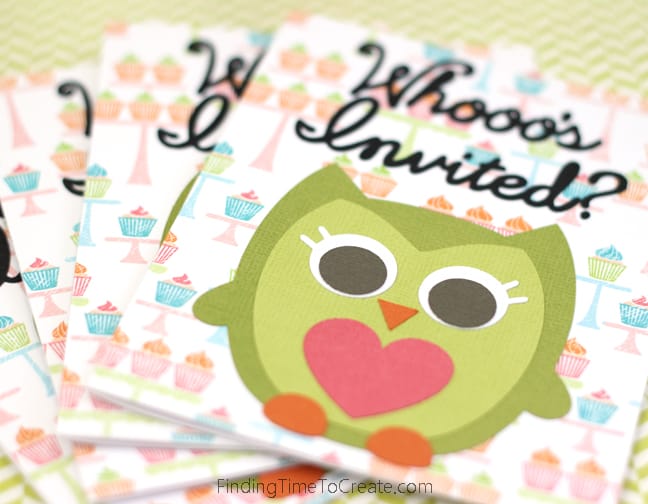 First, I made cute owl invitations with some Silhouette cut files and fonts. Lori Whitlock has created these adorable owls, which I’ve used multiple times. I enlarged the eyeball pieces of this cut file before cutting them, just to increase the cuteness factor. The layered pieces of the owl are cut from different colors of adhesive cardstock (sticky on the back), which makes multiple assembly really quick & easy for a stack of invitations like this.