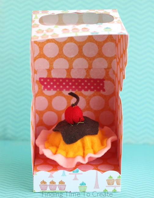 My daughters recently checked out a library book with all kinds of felt crafts, and they made a lot of hand-cut and hand-stitched felt cupcakes. They wanted to give one to their little 6-year-old cousin who was having a birthday, so I made a cute little cupcake box with my Silhouette CAMEO to hold the cupcake.