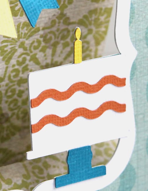 Time was a factor on this birthday card, so I chose the design in the design store, cut the base from double-sided pattern paper, and cut the rest from adhesive cardstock and adhesive gold foil. I had scraps of bright yellow and orange adhesive cardstock, but I cut everything else from white adhesive cardstock and colored the flags and cake base cutouts with markers.