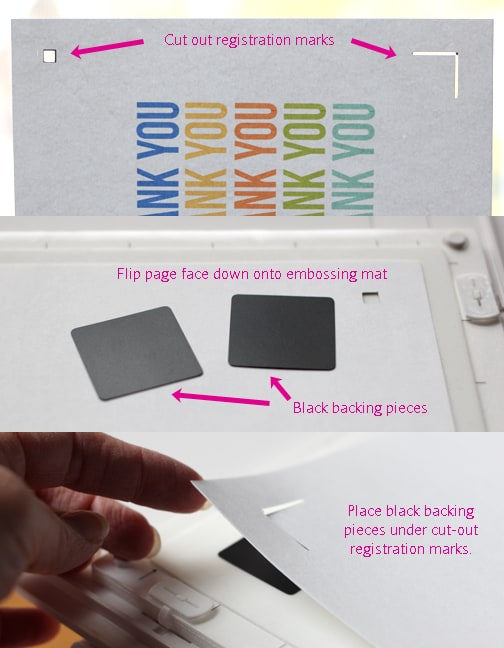Step 3 has you change mats and flip the page horizontally. You’ll need to remove the cutting mat and the #1 platform, and place your embossing mat on top of platforms 2+2. As you place the printed page face down on the embossing mat as instructed, place the thin plastic black squares that came with your Curio so the black shows through those cut-out registration marks.