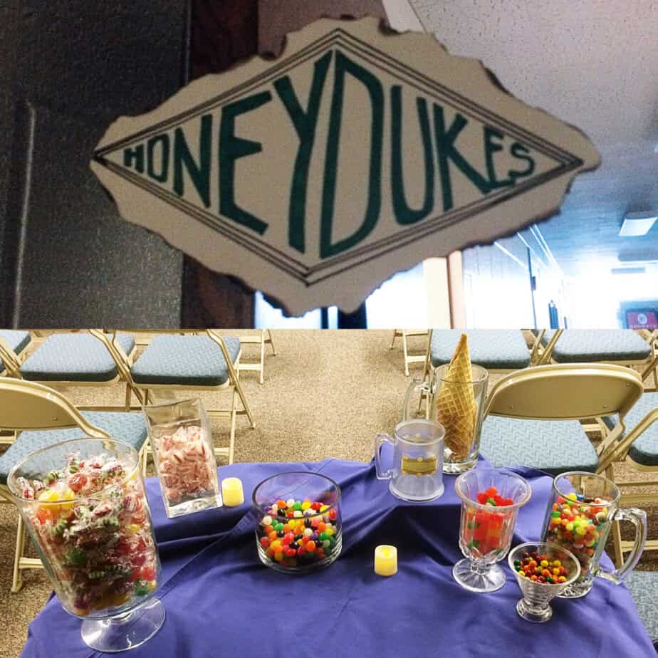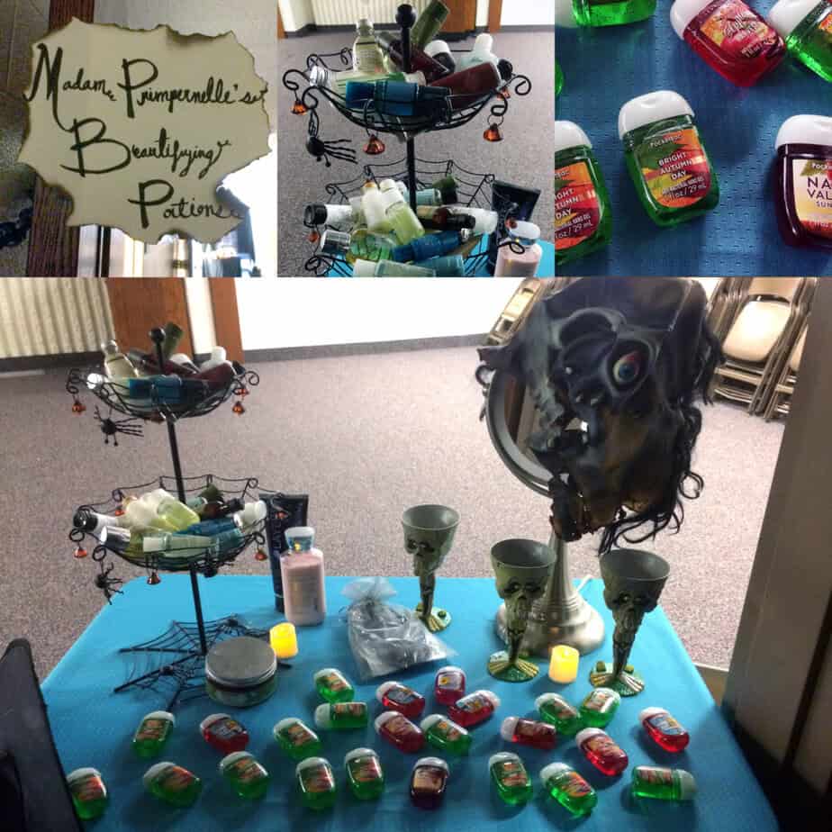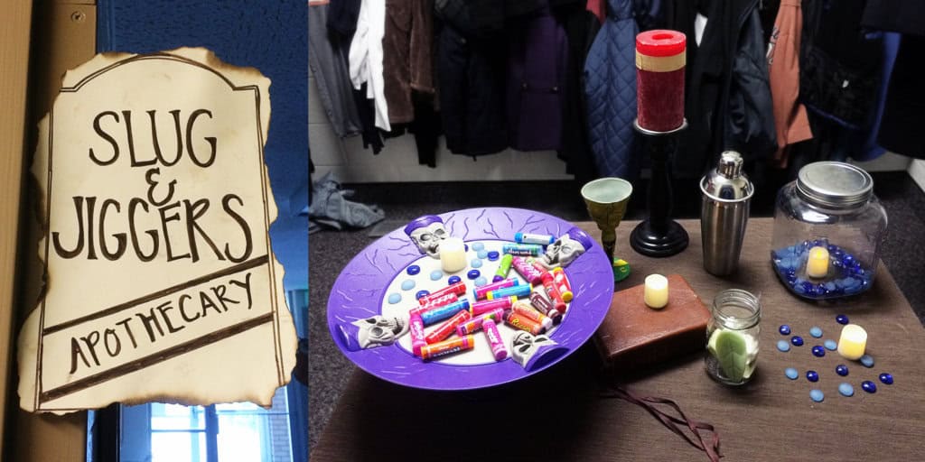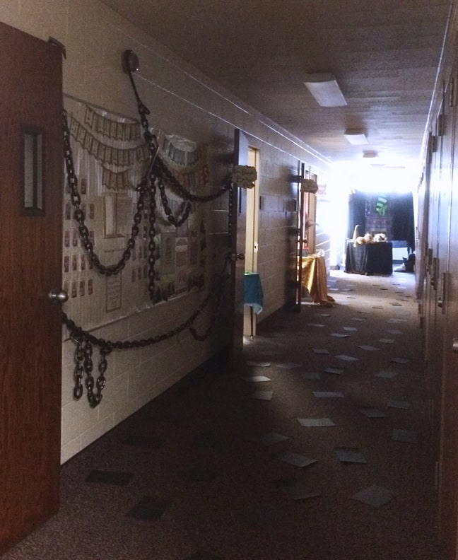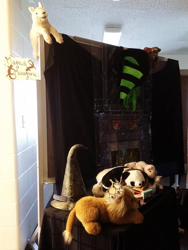 Here is Diagon Alley. Each doorway had a shop sign and some kind of take-away for the girls to collect as they traveled down the hallways. I thought they were very clever to even include a cobblestone street. 😉