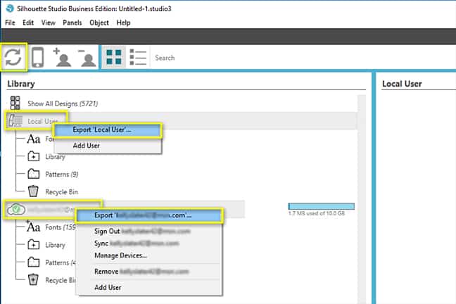- Repeat with the cloud by right clicking on your email address and choosing Export ‘[email]’. (Name it Cloud Library with the date when prompted to save.)