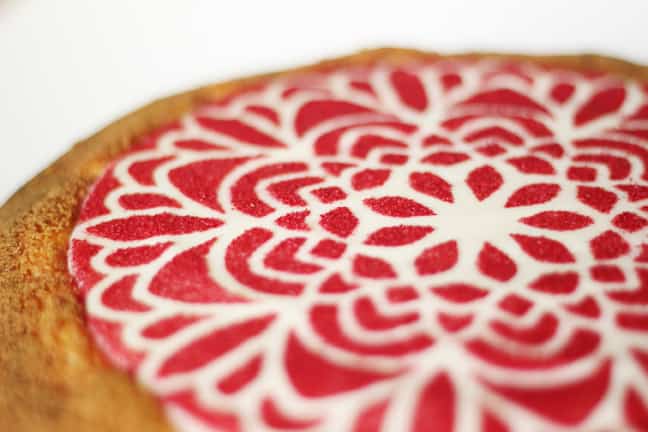 And just because I love watching videos, here’s the cheesecake stencil in action with crushed freeze-dried raspberry powder. Enjoy!
