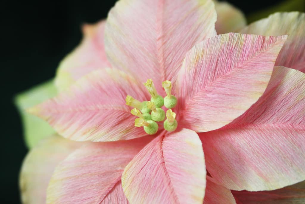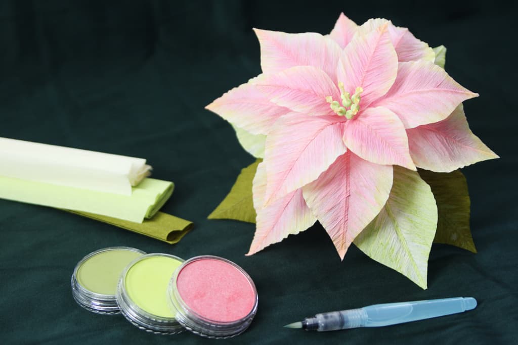 For this watercolor crepe paper poinsettia, I used the instructions provided in this Member Make Project. However, I added additional coloration with Panpastels to correct the original too-bright watercolor paint. The pattern also called for a base of extra-fine crepe paper in linen, but I used vanilla instead. Because of the new skills I’ve learned this year in coloring crepe paper, I was confident in my substitutions and alterations. It looks pretty real, don’t you think?