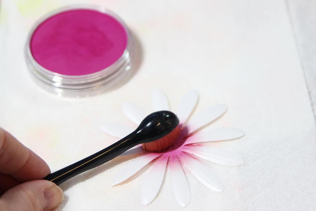 For coloring the petals, keep in mind these all started out as white paper. I dabbed a blending brush into the PanPastel and rubbed it onto the petals carefully enough so they wouldn’t tear but hard enough to really get that color on there.