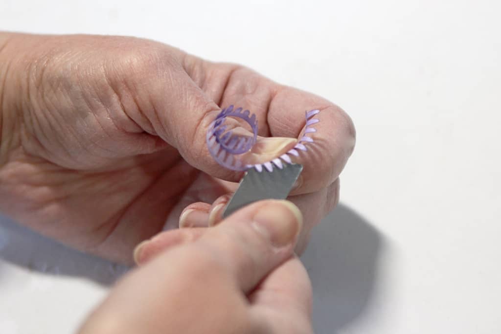 I used the flat edge of my spatula tool to add curl to the stamen before rolling them up, and also to add a little curl to my green leaves.