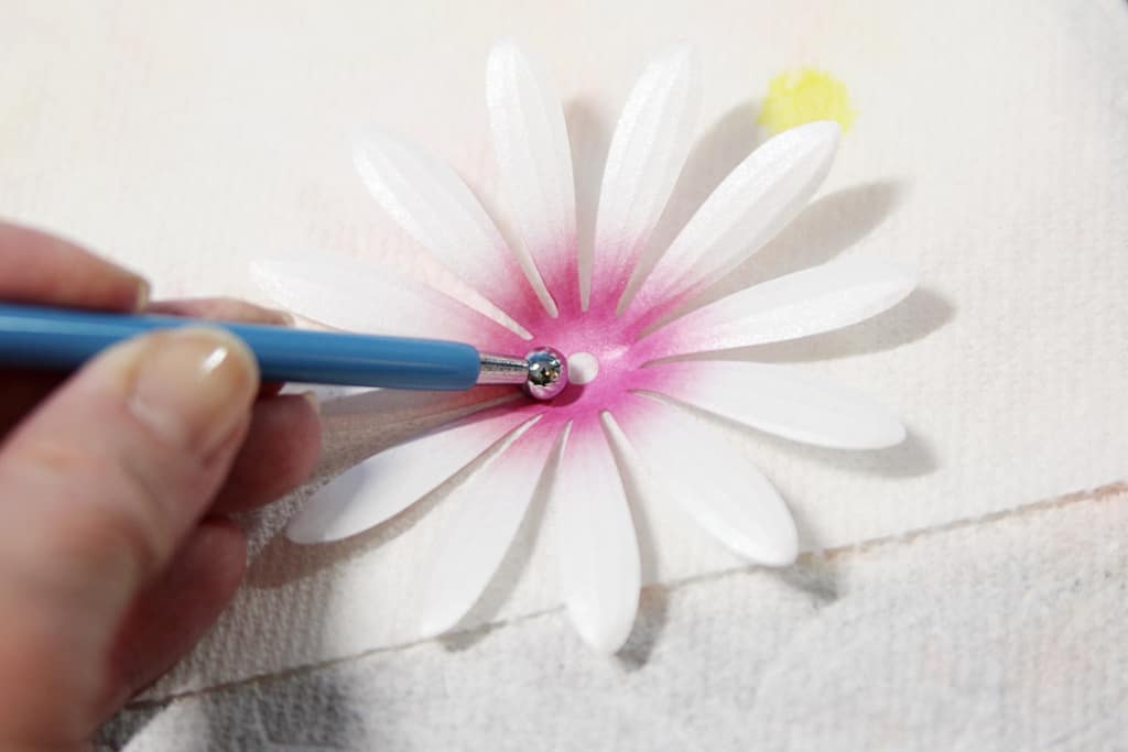 Place a piece of scratch paper or paper towel under your flowers when coloring, because it gets pretty messy. In the centers I used magenta PanPastel most often, but also sometimes orange. Orange and magenta are the most vibrant colors, but I also used pearlescent red on one of these just on the outer tips of the petals (see image below).