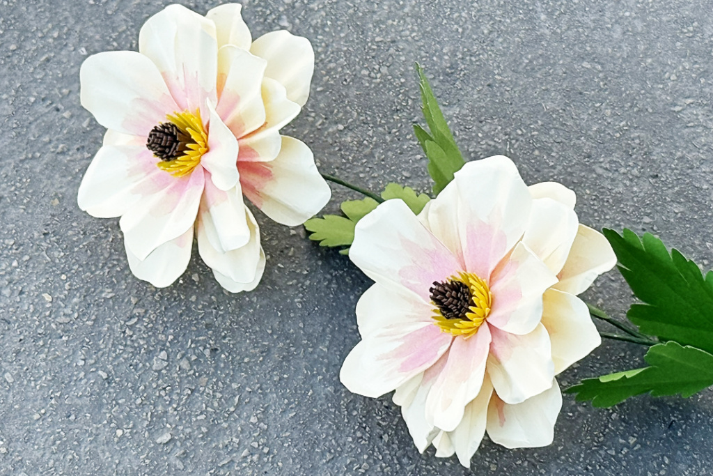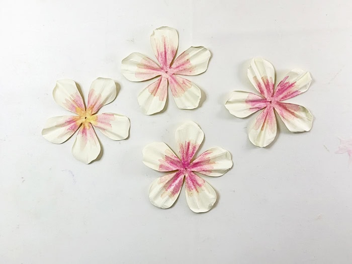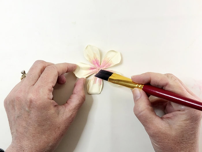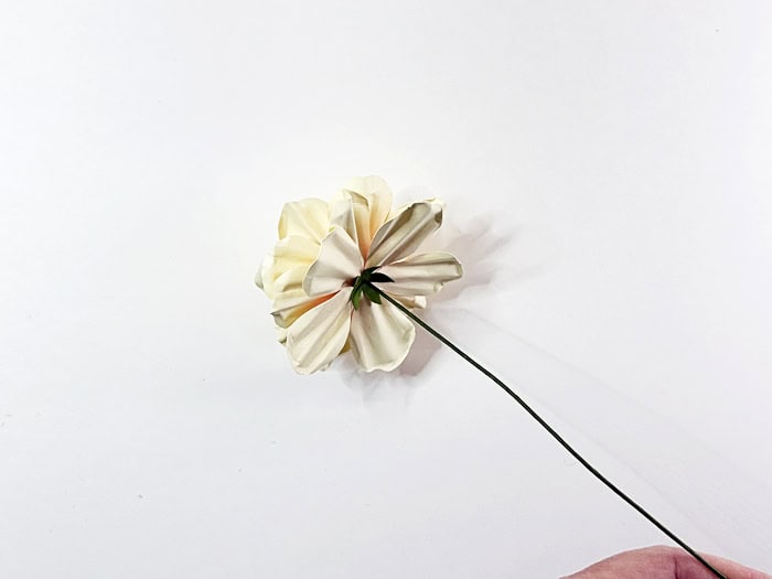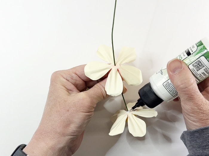 Once the petals are dry, choose the best-looking petal set to add first. Use glue to attach below the stamen on the wire.