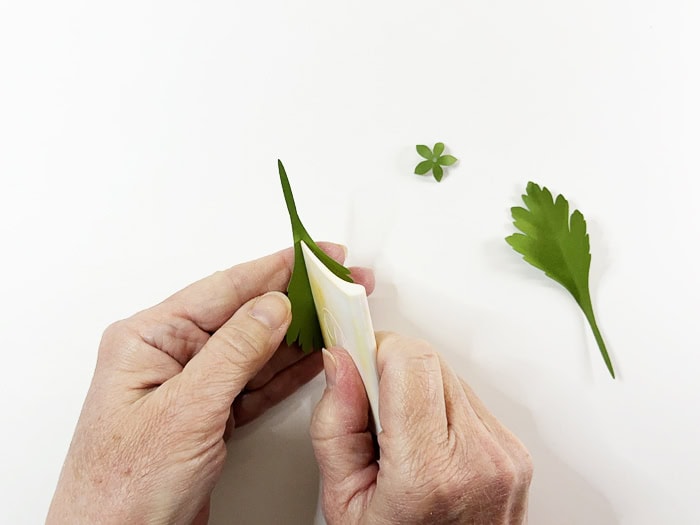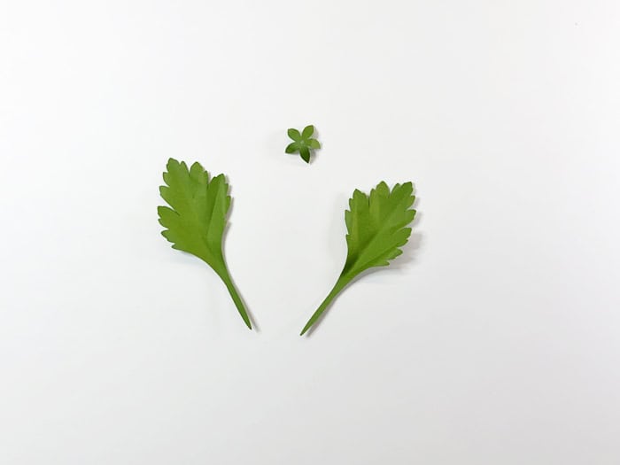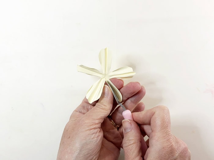 Attach the green sepal with glue to the base of the flower, with the points falling down away from the flower.