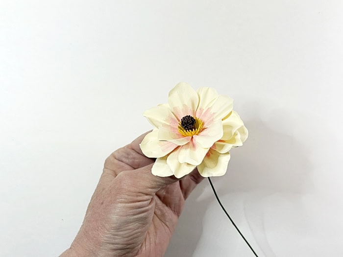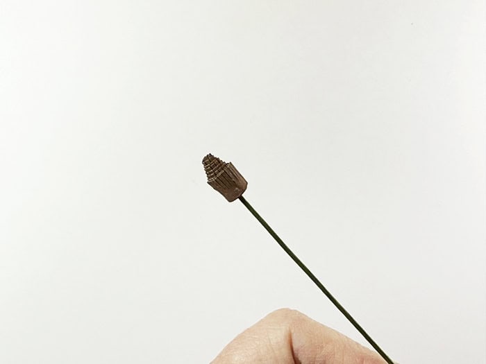- Add extra glue to hold the wire to the brown wrapped stamen. You do not want this piece popping off! Either add more white glue inside to hold the wire in place and let it dry completely (30+ minutes), or add a dot of hot glue inside so it sets faster.