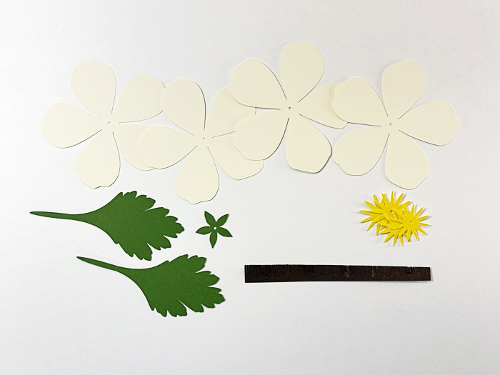 - Medium-weight cardstock (65 lb) in yellow, brown, medium green, and any pale floral color—such as light pink, cream, pale yellow, white, peach, etc.
